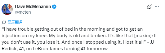 41岁的雷迪克在谈及即将迎来41岁生日的詹姆斯时感慨道:“其实我从今年六月自己满41岁后就开始叫他41岁老头了,所以明天只是个形式,他确实很了不起。我现在早上起床都费劲,膝盖还得打封闭针。身体早就熬得又老又垮了。这正应了那句老话:‘用进废退’。自打我不再高强度打球,身体的各项机能就全荒废了。”