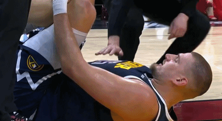第二节即将结束的时候,约基奇被队友斯宾塞-琼斯误伤,后者在防守哈克斯的时候,脚部不慎踩到了约基奇,随后约基奇受伤倒地,痛苦地捂着自己的膝盖。