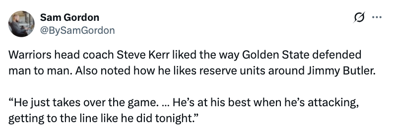 谈及巴特勒靠着罚球把控比赛节奏,这一点有多关键,科尔表示:“这太重要了,绝对是胜负手。他今晚身边搭档的基本都是替补阵容,场上的比赛氛围和攻防节奏都完全不同。很多时候,他直接就接管了比赛。要知道,他和库里搭档登场时,更多会选择让出球权、打无球配合,这一点其实很好理解。但吉米的最佳状态,永远是主动发起进攻、持球冲击内线、造杀伤站上罚球线——就像他今晚做到的这样。”