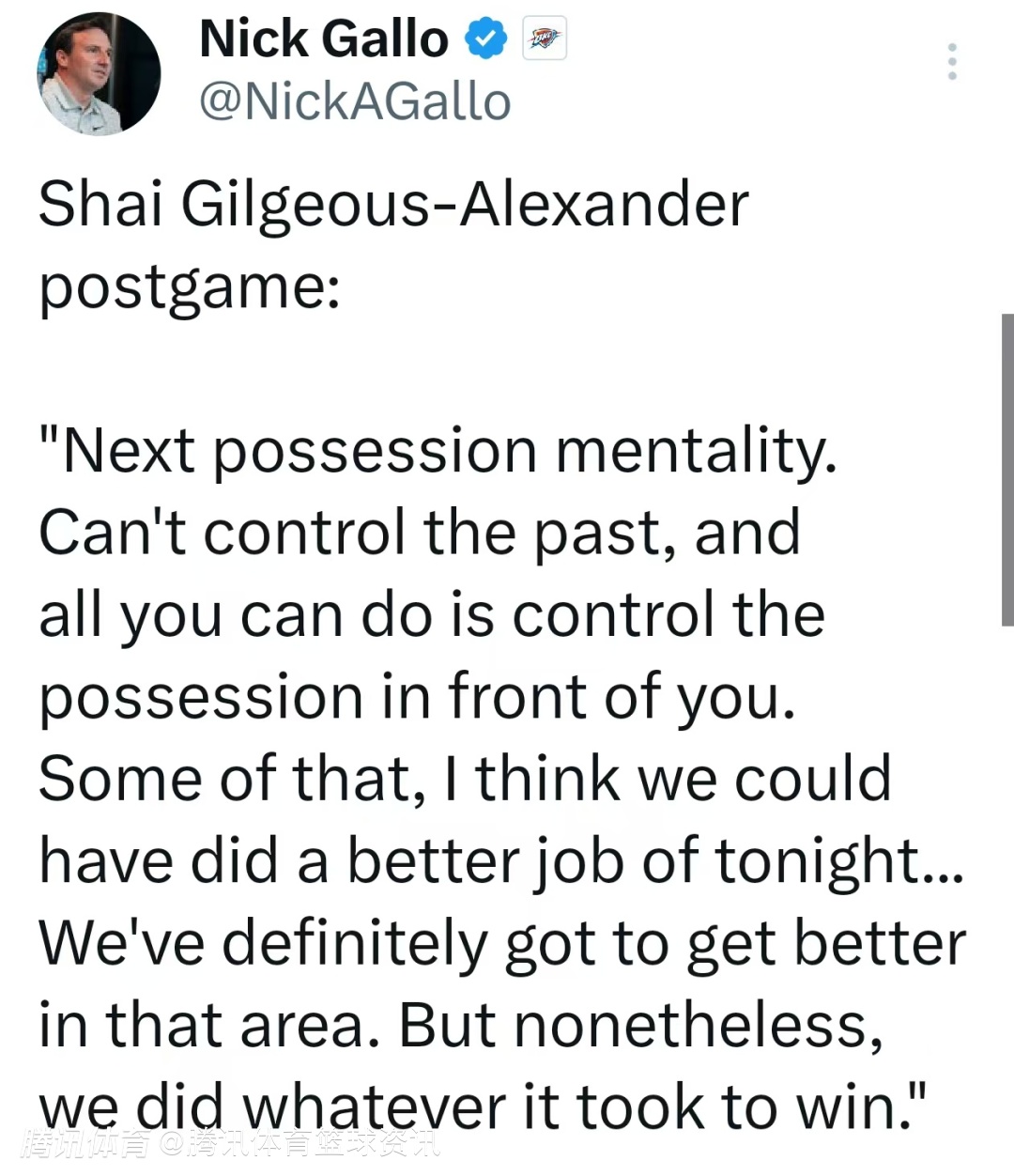 谈及本场比赛,亚历山大表示:“要专注于下一次进攻,过去的事无法改变,唯一能掌控的就是当下的球权。今晚我们有些方面本可以做得更好,也亟需提升,但不管怎样,我们拼尽全力拿下了胜利。”