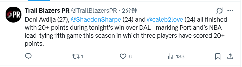 北京时间12月30日,NBA常规赛继续进行,开拓者队125-122击败独行侠队。本场比赛,开拓者队总计有3名球员得分20+,这也让他们追平了本赛季的联盟纪录。