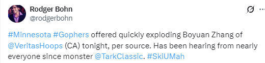 北京时间12月30日,根据NCAA记者Rodger Bohn报道,中国球员张博源已经获得明尼苏达大学的offer。