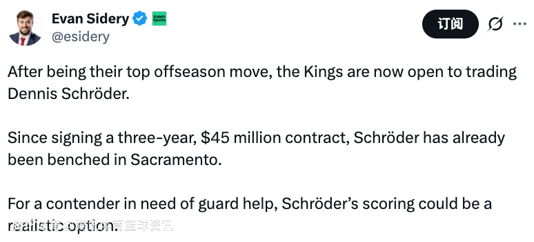 北京时间12月30日,据美记Evan Sidery报道,作为国王队休赛期的头号引援,如今球队已开放关于施罗德的交易谈判。
