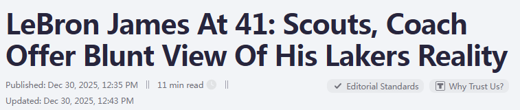第一位匿名球探则对詹姆斯的退役时间及留队前景提出了自己的看法:“我无法断言他在湖人的未来会走向何方,但我始终认为,他不会在本赛季结束后就宣布退役。你或许会觉得,他会像邓肯那样,在某个赛季落幕之后突然告别赛场,但这种低调的方式并不符合詹姆斯的风格。在我看来,本赛季绝非他的生涯绝唱,他大概率希望能开启一段贯穿整个赛季的告别巡演,好好与球迷们告别。不过,我同样不认为他会选择更换门庭。虽然一切尚无定论,但说实话,我有些看不懂他如今坚持打球的初衷, 他在球场上的投入度似乎已经大不如前,现在的他,显然更热衷于高尔夫球,而非篮球。即便如此,倘若他在本赛季结束后就突然宣布离开,想必还是会让所有人都大吃一惊。当然,我的判断也可能存在偏差,但我依然坚持他不会加盟其他球队的观点,毕竟各支球队都很清楚,签下他需要承担不小的负担。”