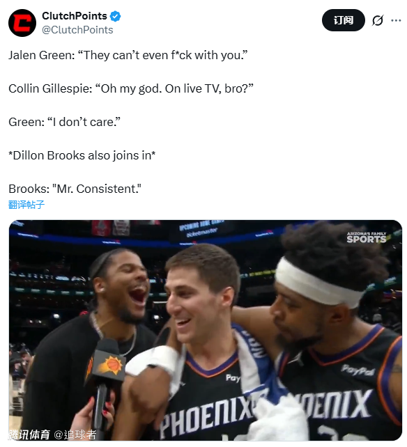 吉莱斯皮回应:“我的天哪,兄弟,这是在电视直播啊?!”随后杰伦-格林表示:“我又不在乎。”