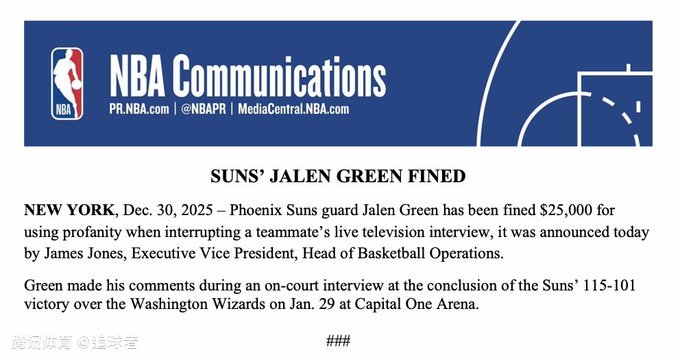 北京时间12月31日,NBA官方通报一笔罚单,太阳后卫杰伦-格林因在打断队友的电视直播采访时使用不当语言,被联盟罚款25000美元。