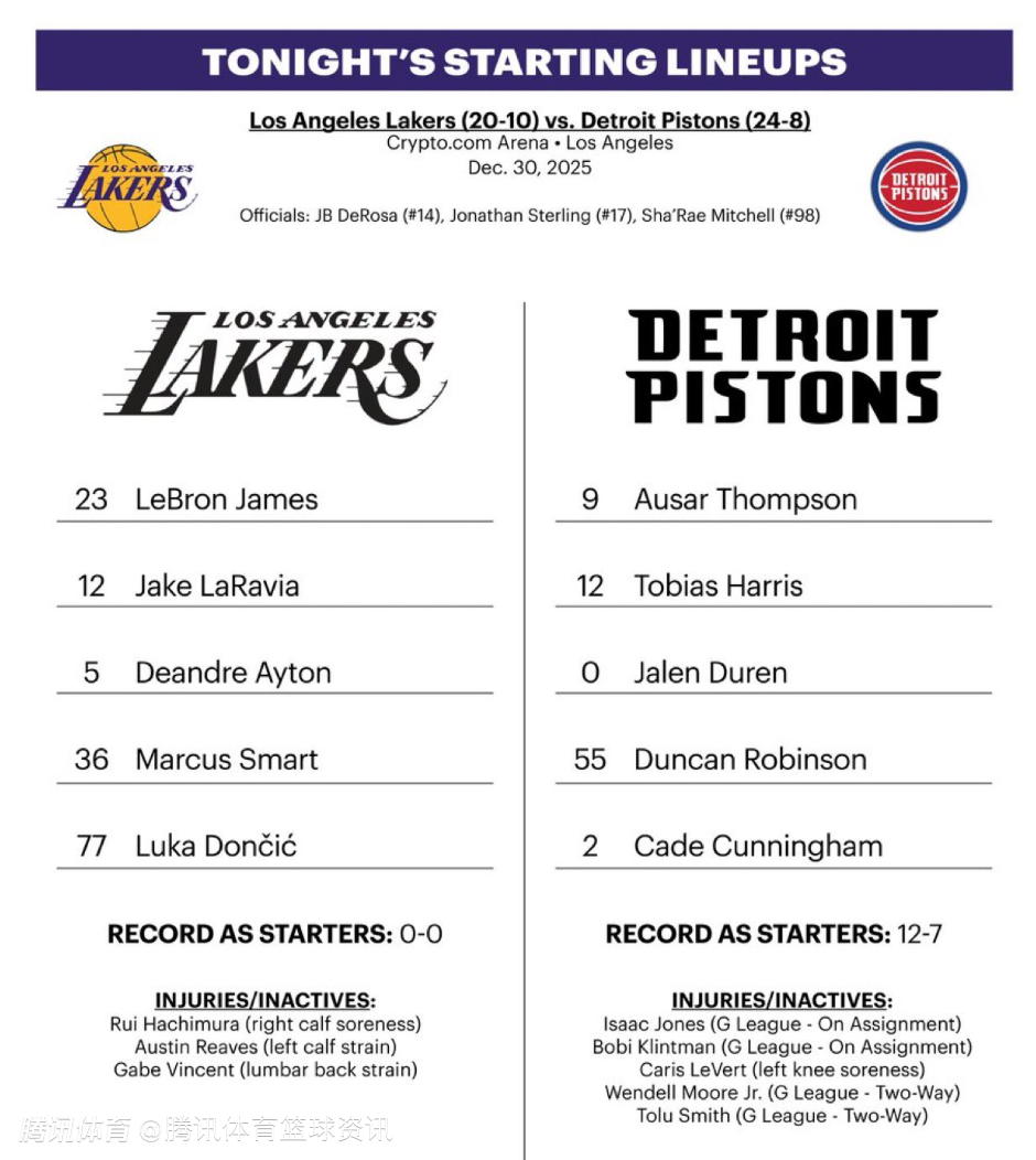 北京时间12月31日,NBA常规赛,湖人将在11点30分坐镇主场对阵活塞,赛前双方公布了本场比赛的首发名单。