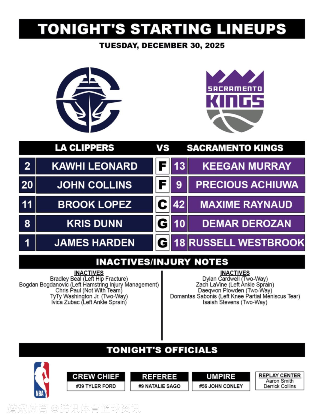 北京时间12月31日,NBA常规赛继续进行,快船对阵国王。赛前,两支球队分别公布本场比赛首发阵容。快船方面,小卡哈登领衔出战,国王方面,威少德罗赞带队应战。