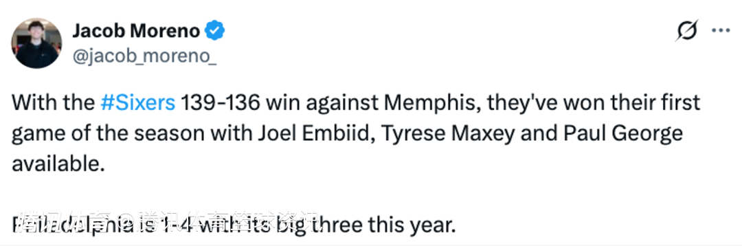 加时赛,埃奇库姆最后时刻接到马克西的传球,命中三分球,1.7秒完成对灰熊的准绝杀。这样一来,76人三巨头本赛季合体的比赛战绩来到1胜4负(本场比赛之前,他们合体遭遇四连败)。