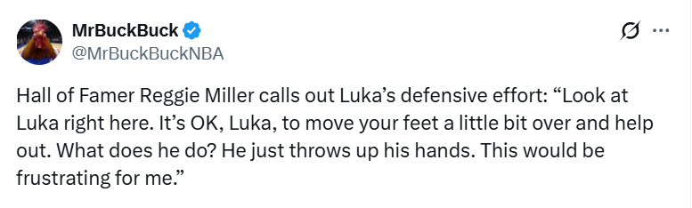米勒拥有一段备受尊敬的NBA生涯,被广泛认为是印第安纳步行者队史最伟大的球员人选。进攻一直是米勒的强项,但同时他也被视为一名拼劲十足、在攻防两端都全力以赴的防守者。在以往的时代,顶级得分手通常至少要承担起平均水准的防守责任。正因为如此,东契奇在防守端几乎不去尝试,才会让像雷吉-米勒这样的传奇人物也罕见地对他提出批评。