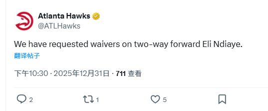 i北京时间12月31日,老鹰官方发布公告,宣布球队已裁掉双向球员、前锋恩迪亚耶。