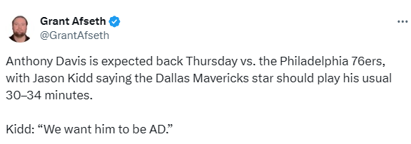 北京时间1月1日,独行侠主帅基德接受媒体采访,确认安东尼-戴维斯将在对阵76人时迎来复出,预计将出战30至34分钟,这与他本赛季健康状态下的出场时间基本一致。