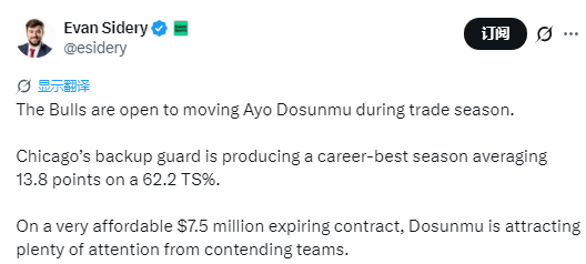 北京时间1月1日,据记者Evan Sidery报道,公牛队在交易窗口期有意送走后卫多森姆。