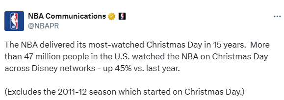据悉,全美共有超过4700万观众,通过迪士尼旗下的各个电视网络收看了本届NBA圣诞大战的赛事,这一数据较去年同比增长45%。(注:该统计不含2011-12赛季,那个赛季的揭幕战恰逢圣诞假期。)