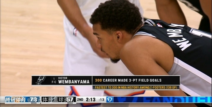 本场比赛之前,文班亚马出战137场比赛,总计命中了299记三分球。第二节比赛结束前2分40秒,文班亚马接到了福克斯的妙传,扬手三分远投命中,完成里程碑。