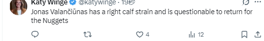 北京时间1月1日,NBA常规赛继续进行,掘金队对阵猛龙队。本场比赛进行到第四节,掘金队官方宣布,瓦兰丘纳斯因右小腿拉伤,本场比赛回归成疑。