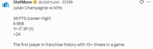 根据数据统计显示,尚帕尼此役砍下36分,创职业生涯新高。单场命中11记三分球,不仅创造马刺队史纪录,还是马刺队史上首位单场三分球命中数上双的球员。此外,单场命中11记三分球,也是NBA落选秀纪录,此前范弗利特也曾单场命中过11记三分球。