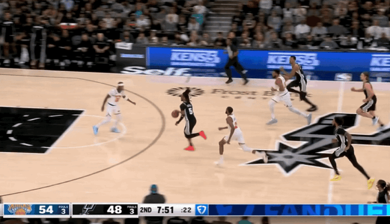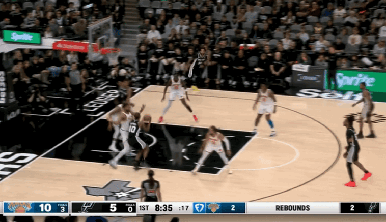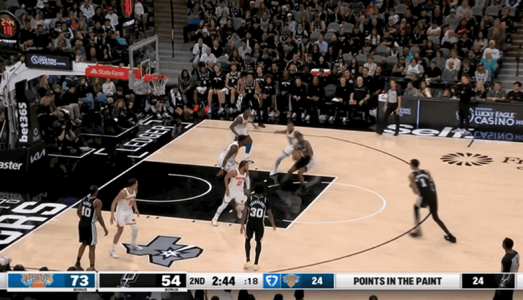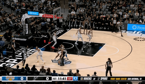 马刺一度实现比分反超,但是当文班亚马下场以后,球队禁区瞬间失守,一旦马刺采取收缩内线空间,尼克斯球员瞬间在外线获得空位出手机会。在布伦森的犀利投射带领下,尼克斯依旧带着9分领先进入第四节。