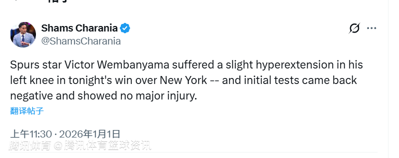 据名记Shams报道,文班亚马在比赛中左膝出现轻微过度伸展损伤,不过初步检查结果显示无碍,未发现重大伤病情况。