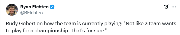 谈到森林狼频繁惨败,戈贝尔表示:“我们不像一支想要争冠的球队,这是肯定的。”