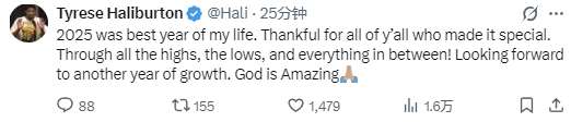 哈利伯顿写道:“2025年是我人生中最美好的一年。感谢每一个让这一年变得特别的人。无论是巅峰时刻、低谷瞬间,还是一路走来的点点滴滴,都感恩有你们相伴!期待新的一年继续成长,感恩上帝的眷顾与恩赐!”