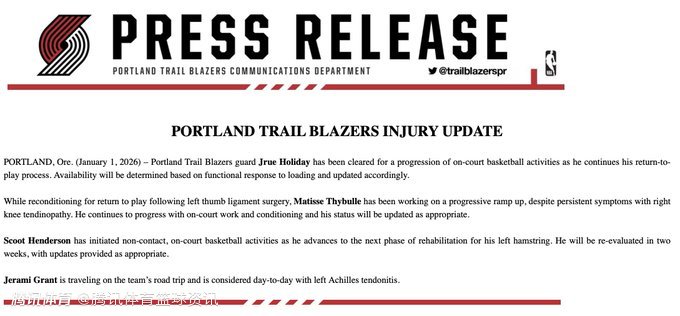 不过,开拓者的这份通告并未给出霍勒迪的具体复出时间表,仅表示“球员的复出时间将根据其训练负荷的身体反馈情况而定,并会实时更新”。