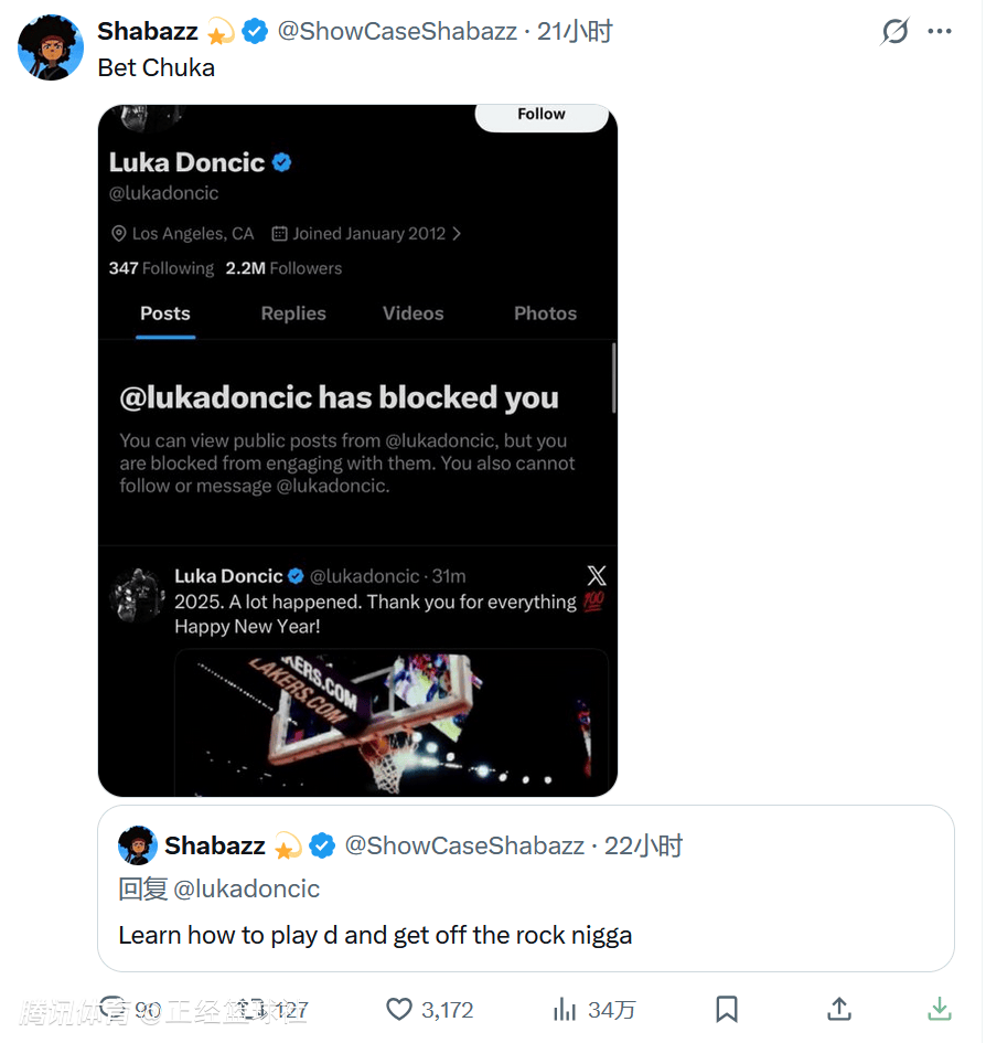 众所周知,湖人队球星东契奇一直因为防守糟糕遭到批评。对此,一位叫做ShowCaseShabazz的球迷在社交媒体上指出东契奇应该学习如何防守和打无球。随即,东契奇直接将其屏蔽,而屏蔽这个功能在英文里叫Block,跟NBA的封盖是同一个词,因为有网友嘲讽:“这是东契奇这辈子最好的防守之一。”
