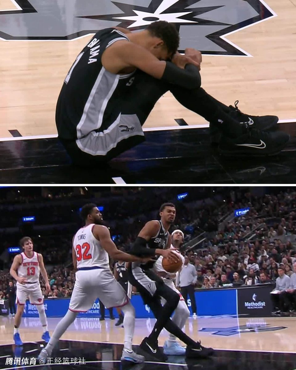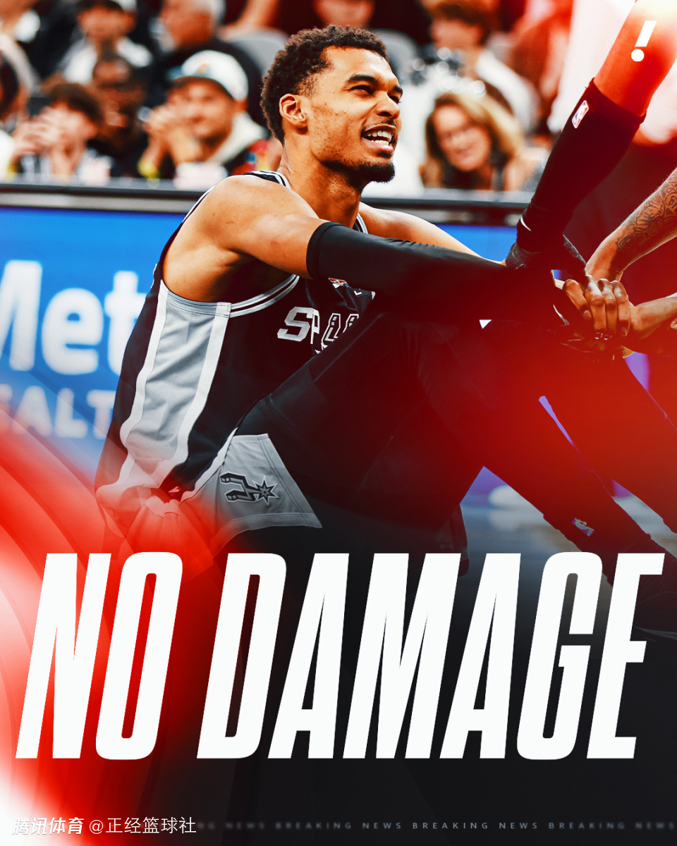 在昨天马刺队击败尼克斯队的比赛中,文班亚马末节伤退。在一个篮板球的争夺中,文班亚马在落地的时候疑似过度伸展,随后他的表情十分痛苦,迟迟没有起身,然后一瘸一拐返回更衣室,之后文班亚马在终场前一分钟回到板凳席。据名记Shams表示,文班亚马的核磁共振没有问题。