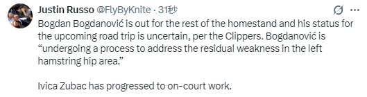 据悉,博格达诺维奇本人正接受针对性治疗,以解决左腘绳肌与髋部区域的残留肌力不足问题。