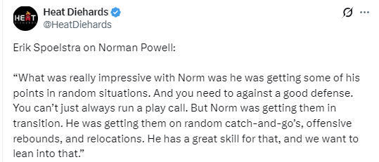 斯波还表扬了热火队的双塔,他说道:“阿德巴约和韦尔在篮板球上表现得非常强硬,活塞是一支防守出色的球队,你不可能总能随心所欲地打出战术,尤其是在半场阵地战中。我觉得我们的转换进攻打得不错,但在半场阵地战中,他们给我们制造了很大的麻烦。所以有时候你必须在胶着的比赛中寻找机会,我们通过二次进攻获得了不少额外的得分机会,这是我们影响比赛的另一种方式。”