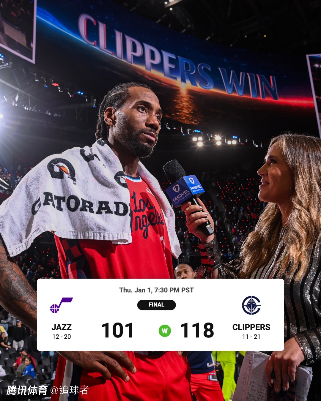 北京时间1月2日,NBA常规赛,快船拒绝逆转118-101击败爵士,豪取6连胜继续强势北伐,12胜21负反超独行侠和爵士升到西部第11位,拿下关键卡位战;小卡狂砍45分以及末节独砍20分,又打出超神一战且连创多项纪录。