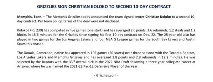 北京时间1月3日,灰熊官方发布公告,宣布科洛科的第二份10天短合同正式生效。这份合同将持续至1月12日,期间覆盖灰熊队接下来的6场比赛。