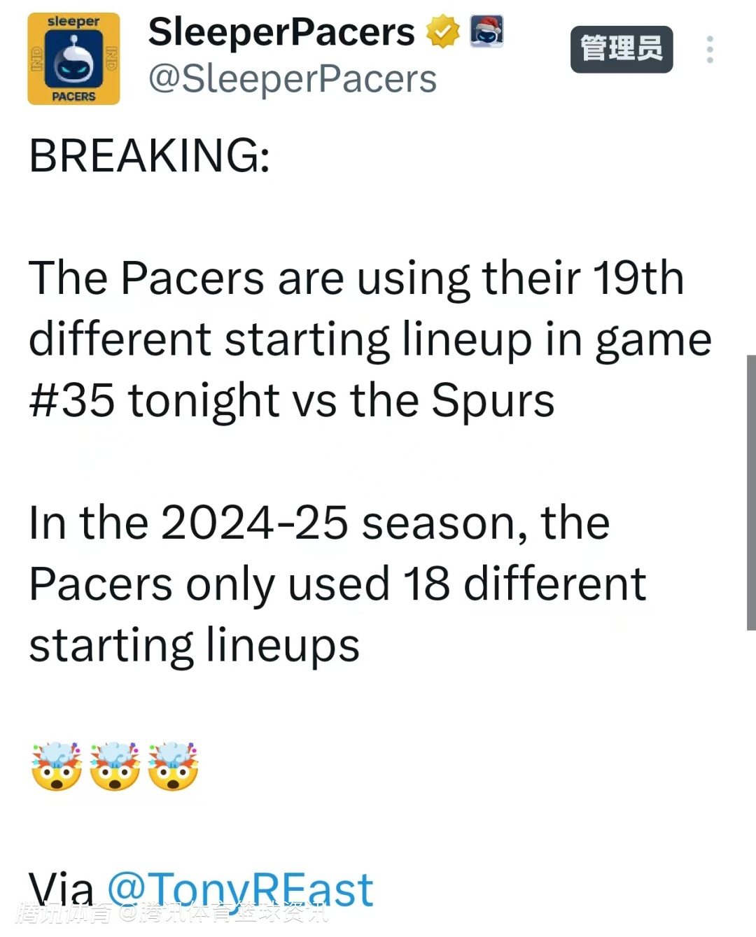 值得一提的是,在今晚对阵马刺的赛季第35场比赛中,步行者将排出本赛季第19套不同的首发阵容。要知道,在整个2024-25赛季,他们总共也只用了18套不同的首发阵容。伤病问题,让步行者的阵容变得很不稳定。