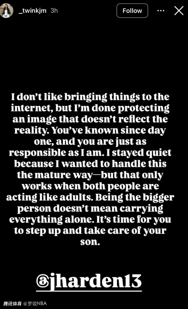 凯尔西-M写道:“我本不想把这种事闹到网上,但我再也不想为一个名不副实的形象买单了。从一开始你就知道真相,你和我一样负有责任。我一直保持沉默,是因为想以成熟的方式处理这件事,但这需要双方都拿出成年人的态度。隐忍不代表要独自承担一切。现在是时候站出来,承担起对儿子的责任了,@jharden13(哈登账号)。”