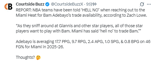 Lowe表示:“当这些球队在打探字母哥等球星的同时,他们也清楚,所有球星都渴望和阿德巴约并肩作战。而热火的态度很明确——想交易阿德巴约?没门儿。”