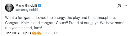 吉诺比利写道:“这场比赛太有意思了!我喜欢这场比赛的活力、赛场表现还有现场氛围。祝贺尼克斯队,也祝贺马刺队!为我们的球员们感到骄傲。球迷们,我们接下来的几年一定会充满乐趣!NBA杯简直太燃了!我爱死它了!”