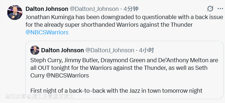 除此之外,本场比赛,库里(脚踝伤势)、巴特勒(生病)、梅尔顿(伤病管理)以及追梦格林(轮休)均将缺席。赛斯-库里同样无缘登场。