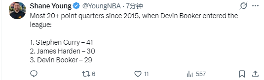 根据数据统计显示,这是德文-布克职业生涯第29次单场砍下20+,自从2015年以来,布克单节20+的次数仅次于斯蒂芬-库里(41次)和詹姆斯-哈登(30次)。