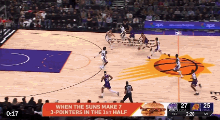 在首节比赛的一次进攻中,布克险些晃倒了尤班克斯,随后轻松投中三分球。除此之外,他还多次高难度跳投得手,打爆了国王队的防线。