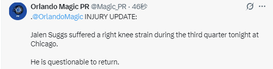 北京时间1月3日,NBA常规赛继续进行,魔术队对阵公牛队。本场比赛进行到第四节,魔术队官方宣布,萨格斯右膝盖扭伤,本场比赛回归成疑。
