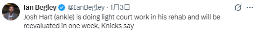 北京时间1月3日,据尼克斯队记Ian Begley报道,尼克斯方面表示球员哈特因脚踝伤势目前仅进行轻度的球场训练,一周后将重新接受评估。