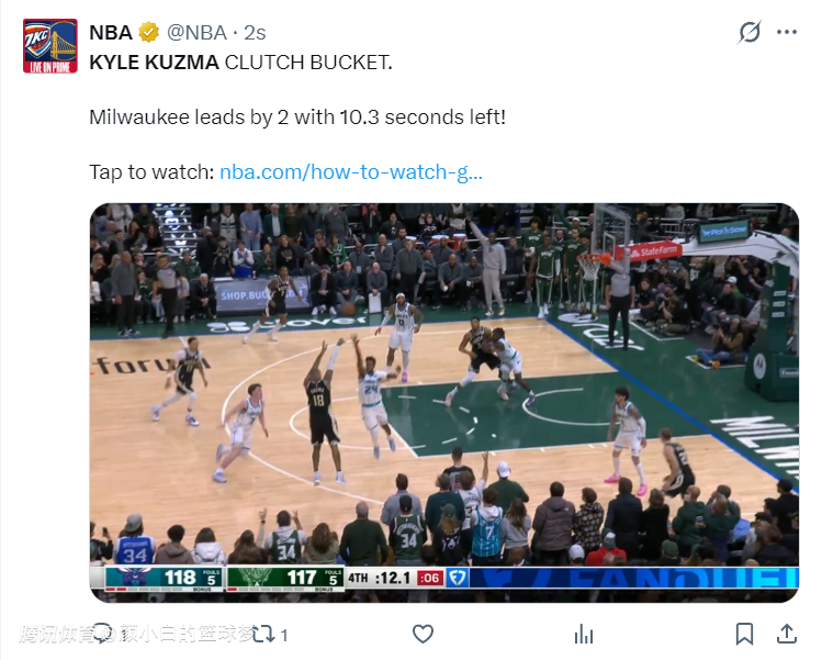 库兹马命中这个120-108的三分球后雄鹿全队开始庆祝,球迷们都站起来庆祝。可很快就笑不出来,因为布里奇斯面对库兹马完成了空接2+1,黄蜂121-120再度反超黄蜂。
