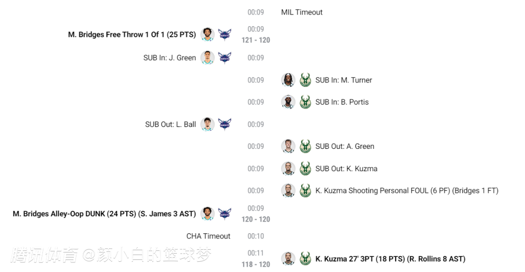 终场前1分34秒库兹马制造了米勒一个进攻犯规,随后罗林斯三分命中反超1分,紧接着布里奇斯突破命中黄蜂再领先1分,终场前11秒库兹马命中反超2分的关键三分球。