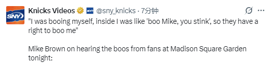 此役,尼克斯主场的球迷由于不满球队表现而送上嘘声,赛后谈到此事时,布朗表示:“其实我自己都在心里暗骂自己,我当时在想‘嘘死迈克-布朗吧,你真是太差劲了’,所以球迷们当然有权嘘我,也有权嘘队里的每一个人。”