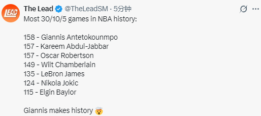 根据数据统计显示,凭借本场的表现,字母哥生涯30+10+5的数据场次达到158场,成功超越贾巴尔与大O(罗伯特森),独占历史榜首。
