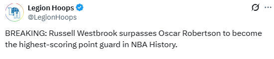 本场比赛之前,威斯布鲁克职业生涯总计得到26694分,距离超越奥斯卡-罗伯特森26710分还差17分。