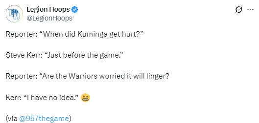 而在谈到库明加何时受伤时,科尔回答道:“就是在比赛开始前。”在谈到勇士队是否会担心这次伤病会持续影响到库明加时,科尔回答道:“我不清楚。”
