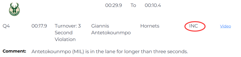 唯一一次漏判发生在距离比赛结束还有17.9秒,报告指出,字母哥在对方禁区停留时间超过3秒,这是一次漏吹的3秒违例。雄鹿获利,黄蜂吃亏。