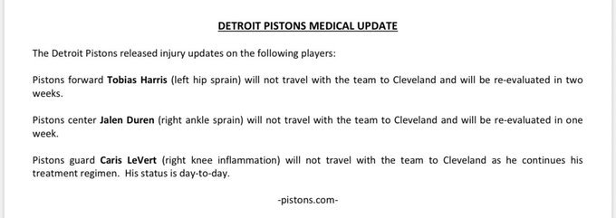 北京时间1月4日,活塞官方更新球队伤情报告,哈里斯确诊左髋扭伤,两周后将接受复查。杜伦遭遇右脚踝扭伤,一周后复查。勒维尔因右膝炎症处于每日观察伤情状态,他将缺席球队客场对阵骑士的比赛,留队继续接受治疗。