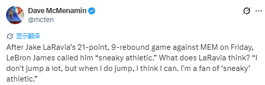 北京时间1月4日,湖人球员拉拉维亚在球队训练结束后接受媒体采访,谈及詹姆斯在上场比赛结束后对自己运动能力的评价。